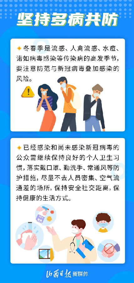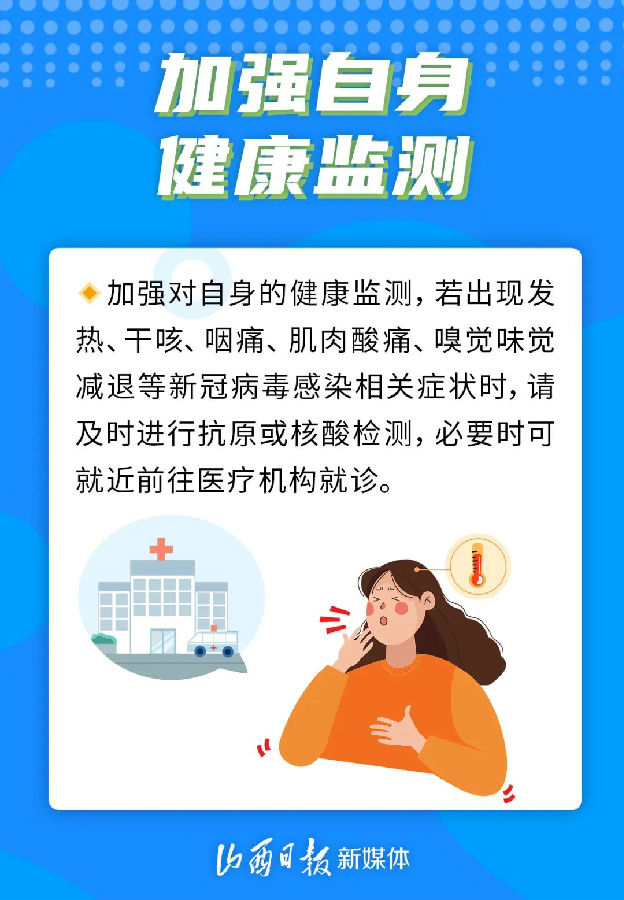 当前,新冠病毒感染已调整为“乙类乙管”,疫情防控进入新阶段。2月8日,山西省疫情防控办温馨提示,现阶段仍应继续坚持做好个人防护和自身健康监测,守护自己和家人的生命安全和身体健康。