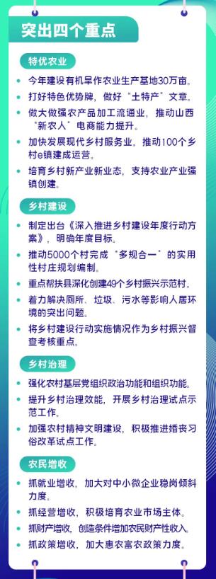 2023年山西省委一号文件公开发布,对全面推进乡村振兴、加快农业农村现代化作出部署。今年的主要指标是:一产增加值增长6%左右,农村居民人均可支配收入增长6%以上,一产固投增长7%左右。主要内容可以概括为“守牢两条底线,突出四个重点,做到四个加强”。