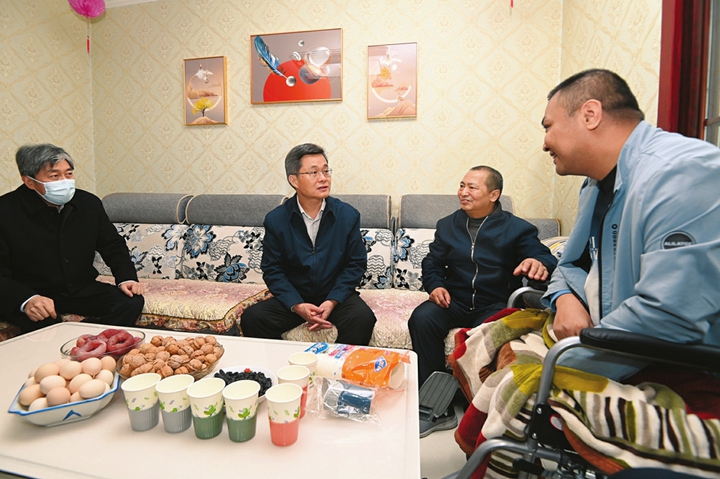 四月二十一日下午,省委书记蓝佛安来到忻州市定襄县晋昌镇北城社区,了解脱贫群众郝生伟、郝华君父子二人的身体、生活状况和享受救助政策情况。本报记者史晓波摄