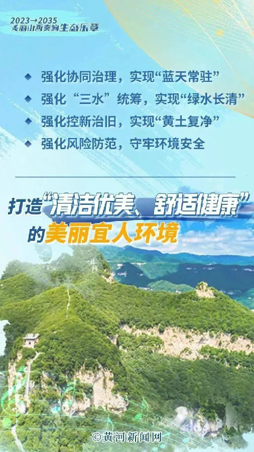 2025年山西省经济高质量发展实现新突破,转型发展形成重大标志性成果,美丽山西建设短板加快补齐,生产生活方式绿色转型初见成效,生态环境质量持续好转,生态系统质量和稳定性进一步提升,现代环境治理体系基本健全;2030年美丽山西建设成效显著;2035年人与自然和谐共生的美丽山西全面呈现。