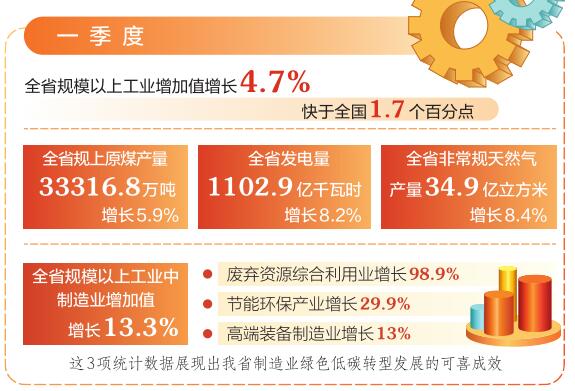 转型发展的落脚点在产业,产业转型的重点是制造业。一季度,全省规模以上工业中,制造业增加值增长13.3%。废弃资源综合利用业增长98.9%、节能环保产业增长29.9%和高端装备制造业增长13%,这3项统计数据展现出我省制造业绿色低碳转型发展的可喜成效。制造业的高质量发展,对全省经济增长和技术进步的带动作用明显。