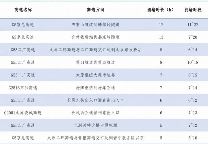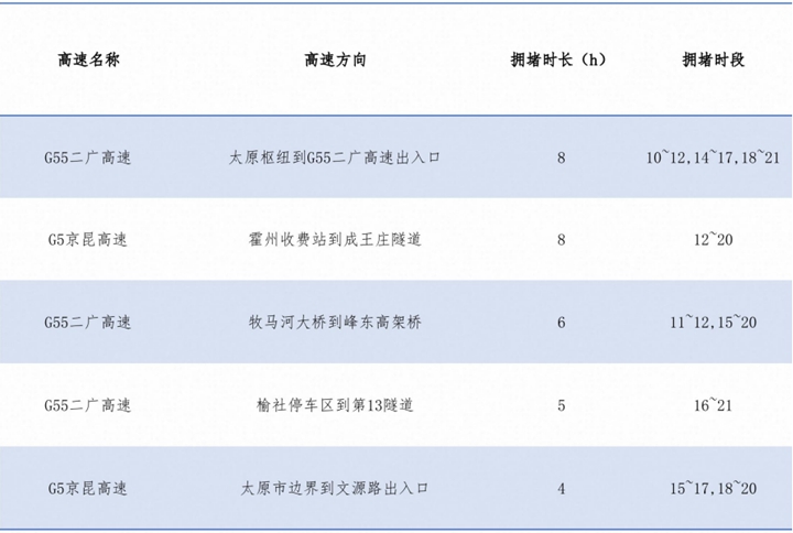 (1)拥堵可能出现在:G55二广高速忻州段忻州—G2003太原绕城高速东环段松庄;G5京昆高速太祁段夏家营枢纽—罗城枢纽、G5京昆高速祁临段明姜—霍州—平遥;G55二广高速太长段榆社—太谷。