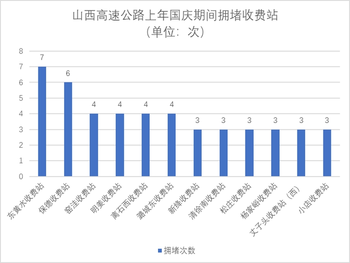 (4)流量较大收费站:G5京昆高速平阳段东黄水收费站、G1812沧榆高速忻保段保德收费站、窑洼收费站、G5京昆高速祁临段明姜收费站、G20青银高速汾离段离石西收费站、S2201长治绕城高速潞城东收费站。