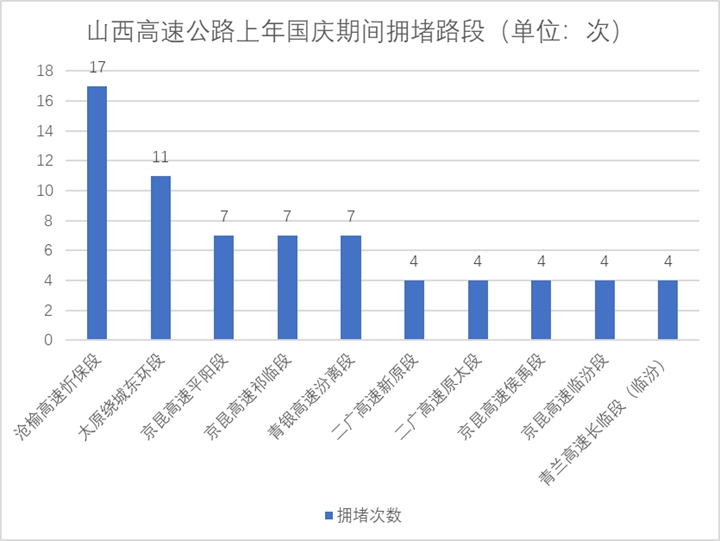 (5)流量较大路段:主要拥堵路段集中在G1812沧榆高速忻保段、G2003太原绕城东环段,另G5京昆高速平阳段、G5京昆高速祁临段、G20青银高速吕梁段等部分路段在高峰时段可能会出现车多缓行现象。