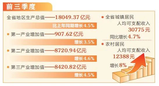 山西日报记者冷雪报道 10月23日,山西省统计局和国家统计局山西调查总队联合发布了前三季度山西省经济运行情况:全省地区生产总值为18049.37亿元,比上年同期增长4.5%。全省经济继续保持平稳复苏、稳中向好的发展态势,三次产业稳步增长,有效需求逐步恢复,就业物价总体稳定。 “今年以来,全省上下坚决贯彻落实党中央、国务院和省委、省政府各项决策部署,坚持稳中求进工作总基调,完整、准确、全面贯彻新发展理念,扎实推动了全省高质量发展。”省统计局副局长、新闻发言人王育民表示。 前三季度,第一产业增加值为907.62亿元,增长3.5%;第二产业增加值为8720.94亿元,增长4.6%;第三产业增加值为8420.82亿元,增长4.5%。今年以来,农业生产稳定增长,畜牧业生产增势良好;工业生产平稳增长,新动能不断积蓄;服务业较快增长,互联网领域涨势较好。 今年以来,全省煤炭、电力、天然气持续安全稳定供应。全省规上原煤产量101439.7万吨,增长4.5%;发电量3229.8亿千瓦时,增长4.7%,其中外送电量1168.1亿千瓦时,增长10.9%;非常规天然气产量105.2亿立方米,增长7.8%。 在全省规模以上工业中,战略性新兴产业增加值增长12.5%。其中,节能环保产业增长36.3%;废弃资源综合利用业增长57.9%,食品工业增长8%,均快于全省规上工业增速。在全省服务业中,住宿和餐饮业增长14.6%,金融业增长7%,交通运输、仓储和邮政业增长6.3%,均快于全省服务业增速。 前三季度,全省新型消费快速增长,在全省限额以上消费品零售额中,照相器材类零售额增长5.3倍,新能源汽车零售额增长55%,可穿戴智能设备零售额增长49.4%。另外,随着消费市场复苏,山西省出行类商品销售带动明显,旅游市场也出现持续回暖。全省重点监测景区的接待人数6600.6万人次,增长1.3倍;门票收入22.2亿元,增长1.7倍;经营收入38.2亿元,增长1.6倍。 今年以来,山西省居民收入稳步增长,就业形势总体稳定。全省城镇居民人均可支配收入30775元,同比增长4.7%;农村居民人均可支配收入12388元,增长8%。全省城镇新增就业42.6万人,已完成全年目标的94.7%。