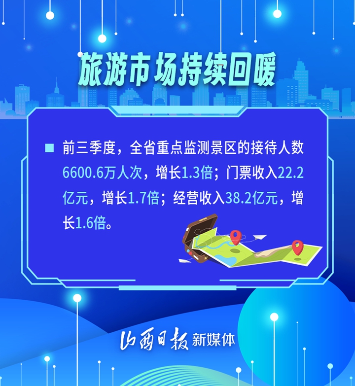 10月23日,山西省统计局和国家统计局山西调查总队联合发布前三季度山西经济运行情况。前三季度,山西经济继续保持平稳复苏、稳中向好的发展态势,三次产业稳步增长,有效需求逐步恢复,就业物价总体稳定。详细数据,一组海报了解。