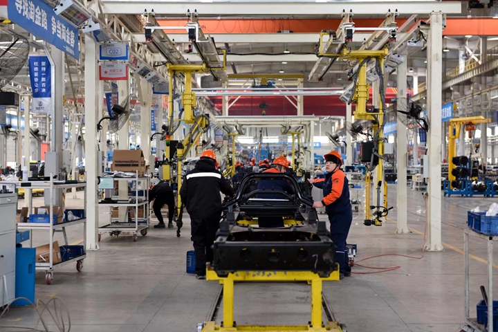 ▲甲醇重卡正在流水线上装配