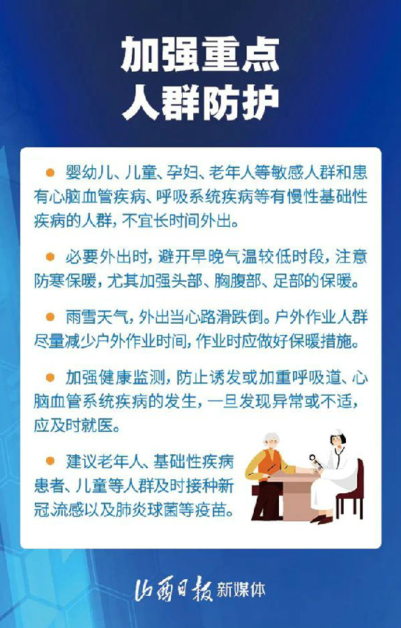 近期寒潮来袭,山西部分地区气温大幅下降。寒冷天气易引发或加重高血压、冠心病、脑卒中等多种心脑血管疾病,以及上呼吸道感染(普通感冒、流感)、肺炎等疾病,省卫健委、省疾控局提醒广大公众,要加强保暖防护,特别关注气温骤降带来的健康危害。