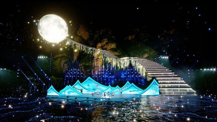 节目的舞美设计以“放歌山水间”为概念,强化“思想+艺术+技术”融合,在山西省晋中市左权县“百里画廊”山间打造了具有山水元素、虚实结合的实景舞台,依托总台AR技术,呈现了丰富多彩的民歌舞台景观。