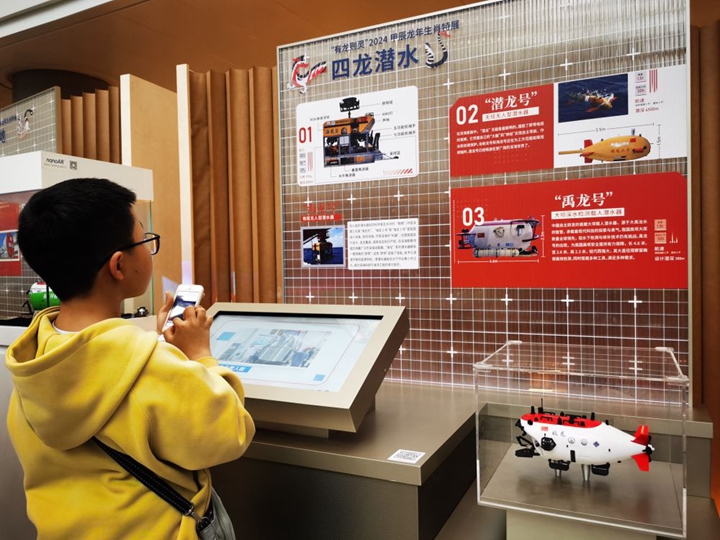 最让王壹父女振奋的是,展览引入相关模型、图文、视频,对当代名字中带有“龙”字的大国重器进行了详细介绍:从“华龙一号”的核能之光,到“蛟龙号”深海探索;从“鲲龙”号翱翔碧海蓝天,到“雪龙”号破冰前行……