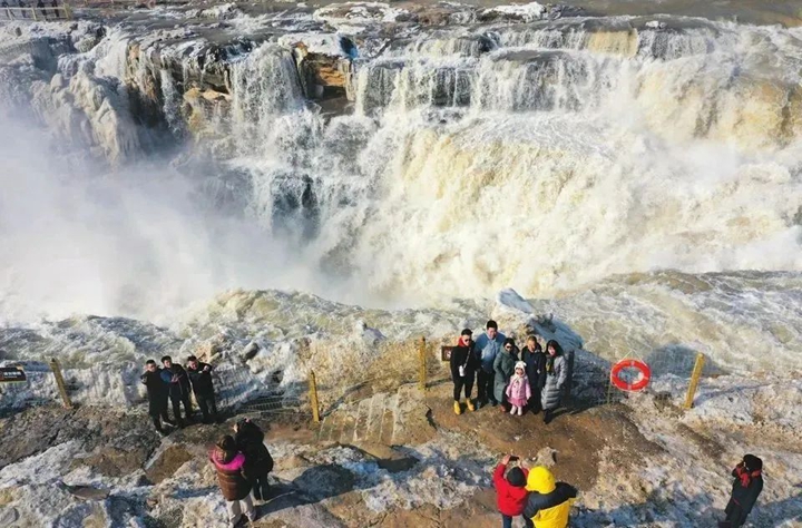 ▲2月9日,游客在吉县黄河壶口瀑布游览观瀑。“立春”后,受气温回暖影响,吉县黄河壶口瀑布冰消河开,再现奔腾咆哮的壮美景观。吕桂明摄