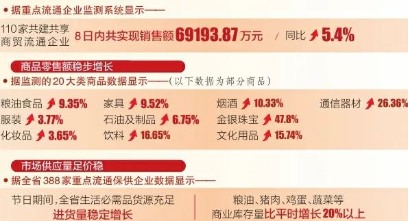 省商务厅相关负责人介绍,总体来看,全省各级商务主管部门认真落实生活必需品、重点零售和餐饮企业日报制度和生活必需品市场异常情况“零报告”制度,从市场供应、扩大消费等方面入手,完善应急措施,压实工作责任,多措并举确保了节日市场繁荣稳定。