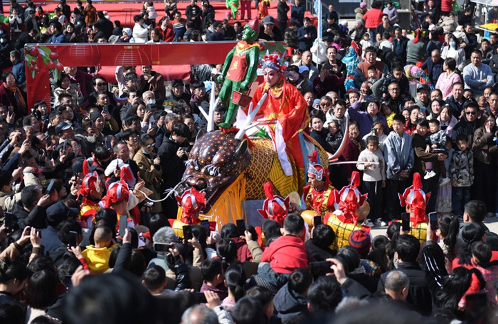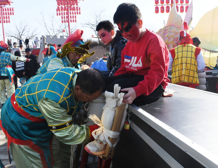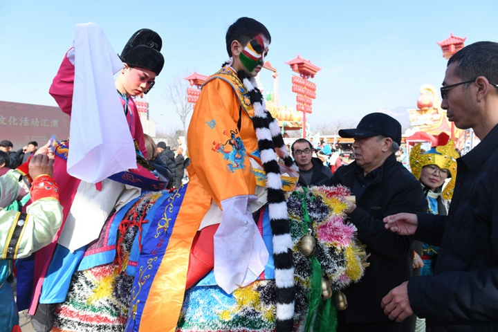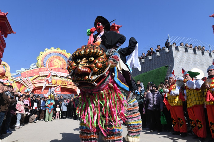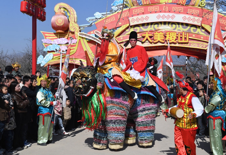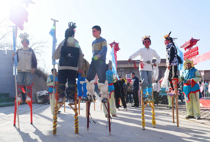 2月17日,稷山县清河镇阳城村的民间艺人在表演高跷走兽闹新春。高跷走兽是稷山县当地的一种传统民俗社火文化,至今已有三百多年的历史,现有的阳城高跷走兽有独角兽、貅狼、麒麟、猫、黑狸虎、梅花鹿、貘等。它是由两人表演的连体高跷,高跷走兽由兽头、兽身和表演人员组成,表演时将人与兽巧妙组合,精心装扮,由二人足踩高跷同演骑兽状,按曲牌节拍行走,配锣鼓、花鼓等打击乐器,演绎一个个美丽的神话传说。2006年5月,高跷走兽被列入第一批国家级非物质文化遗产保护项目名录。