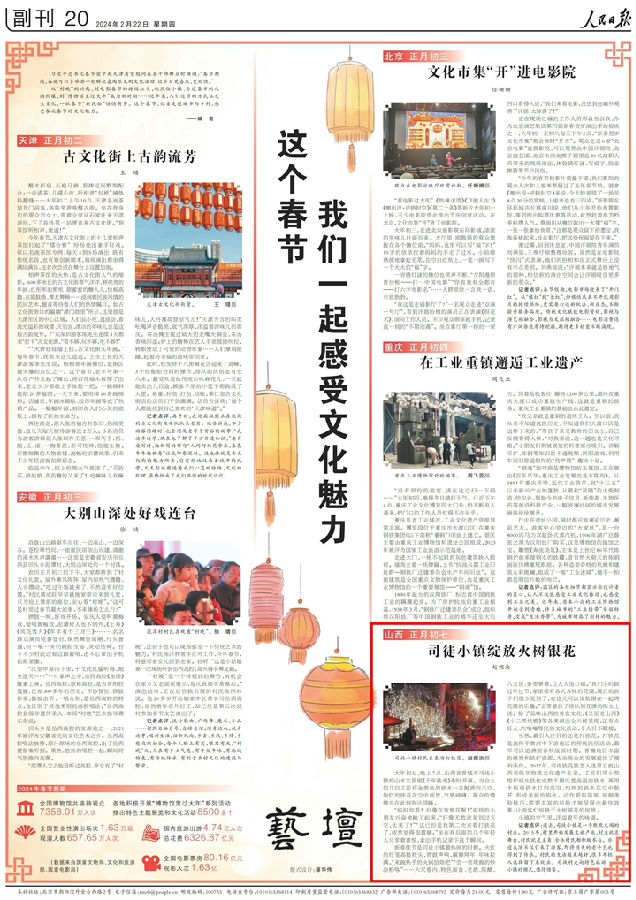 新春佳节是司徒小镇最热闹的时候。火红的灯笼高挂枝头,锣鼓声响,醒狮拜年,年味拉满。“来碗热乎的火锅饸烙吧”“尝一尝现做的炒凉粉咯”……六尺巷内,特色面食、老酒、陈醋、八宝饭、姜枣茶等,让人大饱口福。“我们小时候过年过节,家里都有各式各样的花馍,现在的孩子们很少见到了,在这儿可以体验围在一起烤花馍的乐趣。”正带着孩子排队领花馍的陈女士说。除了品味山西的美食文化,《又见老山西》《小二黑结婚》等各类演出全天候呈现,还有点旺火、吹咯嘣等民俗文化活动,令人目不暇接。