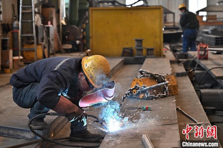 工人在车间气保焊作业。 中新网记者 韦亮 摄