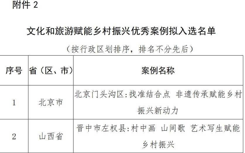 近日,记者从中华人民共和国文化和旅游部网站获悉,文化和旅游赋能乡村振兴“十佳”案例和优秀案例拟入选名单公示。