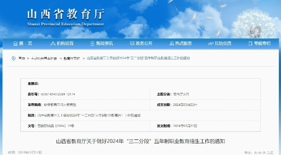 近日,记者从山西省教育厅网站获悉,根据山西省委办公厅、省政府办公厅印发的《关于推动现代职业教育高质量发展的实施意见》部署,为持续推进中高职协调发展,2024 年山西省将继续开展“三二分段”五年制人才培养工作。
