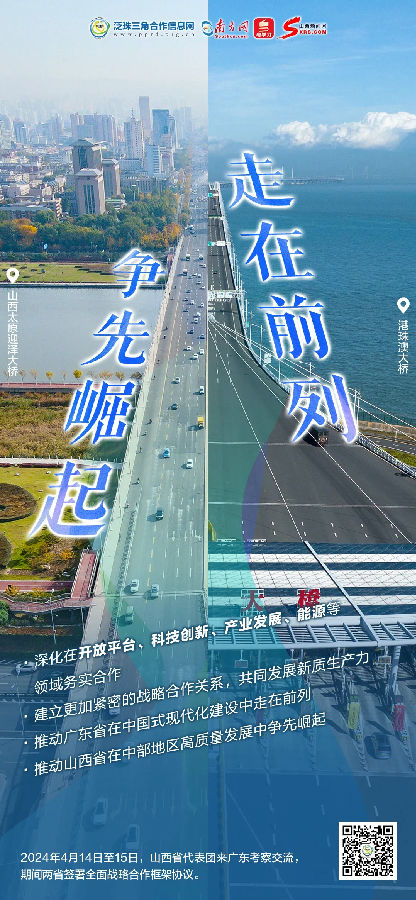广东是我国第一经济大省,是改革开放的排头兵、先行地、实验区,在全国发展大局中具有举足轻重的地位。山西则承担着建设国家资源型经济转型综合配套改革试验区、开展能源革命综合改革试点等重要使命。泛珠网、南方网、粤学习客户端联合山西新闻网,用三张图告诉你,广东、山西此次相“粤”珠江将如何行动,谋求加强深层次、多领域、全方位的合作交流,共“晋”未来。