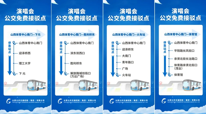 2.演唱会期间,每天在演唱会结束后22:15至23:15,开通从山西体育中心南门分别到下元、火车站、胜利桥东、体育馆4条公交接驳专线。分别为: