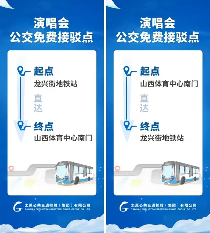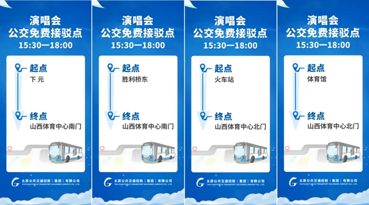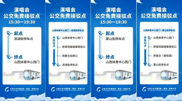 3.演唱会开场前15:30-19:30,开通2条临时停车点至山西体育中心的公交接驳专线。分别为: