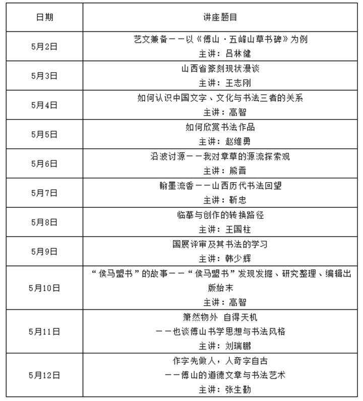 为助力国展,营造学习氛围,山西省书协精心打造“书法公益大讲堂”,从5月2日至5月12日,每天10:00-11:30在山西省展览馆1号展厅举办,特别邀请全省知名书法家担任主讲,名家众多,内容丰富。