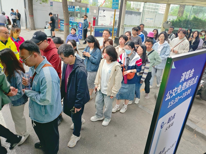 ▲在太原市五一东街火车站接驳点歌迷准备乘车