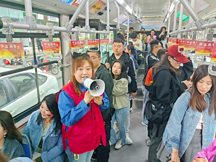 ▲行车过程中,志愿者贴心地为来自全国的歌迷们介绍太原人文历史