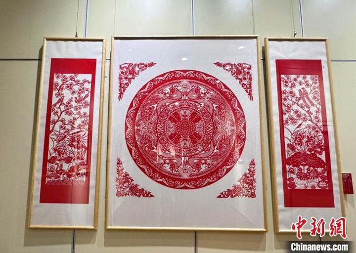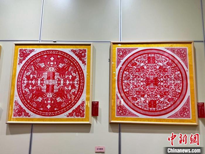 5月7日,120幅由山西省级非遗项目(阳泉盘合)传承人梁盛萍创作的剪纸作品正在山西太原文瀛公园展出。此次展出作品包括民风民俗、文旅融合等主题,其中,展示山西传统婚俗文化的“阳泉盘合”系列剪纸作品受游客围观。