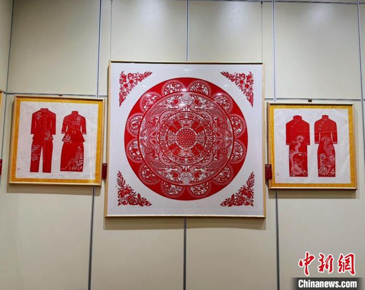现场展出的盘合作品和《婚俗服饰》系列剪纸作品。杨静摄