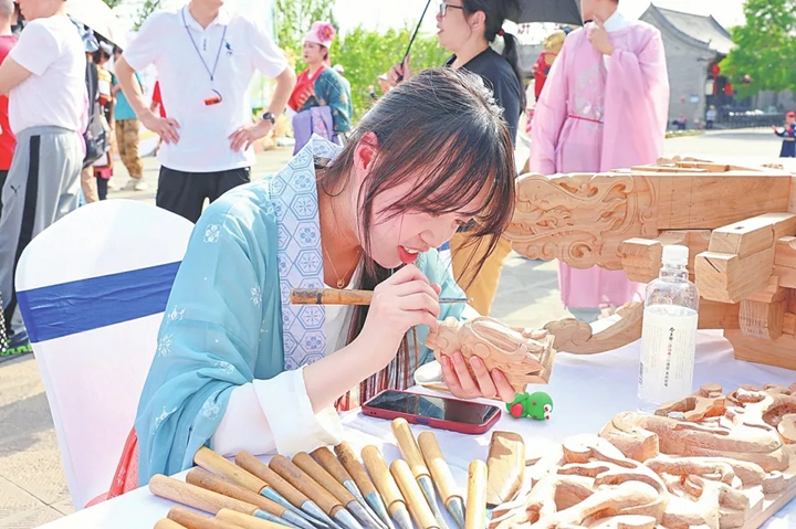 中国旅游日当天,游客在乔家大院景区沉浸式体验木雕制作。记者栗美霞摄