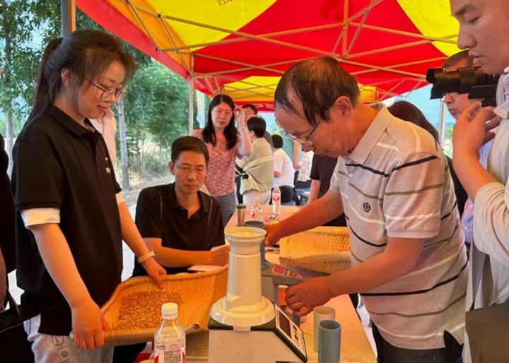 测产专家组按照《全国粮食高产创建测产验收办法(试行)》,进行清仓、丈量田块、过磅称重、测定籽粒含水率、去杂等程序,收获面积11.78亩,鲜重8560公斤,籽粒平均含水率17.32%,折算成13%标准含水率净重8134.95公斤,折合亩产690.57公斤。