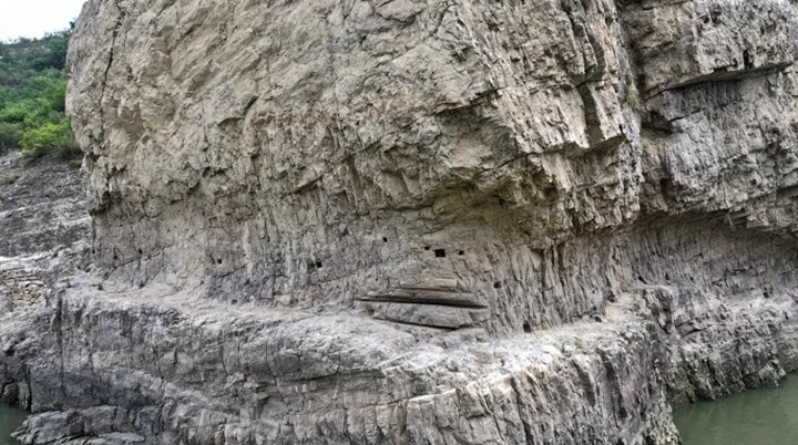 ▲古栈道岩壁上,一个挨一个的四方洞和牛鼻孔