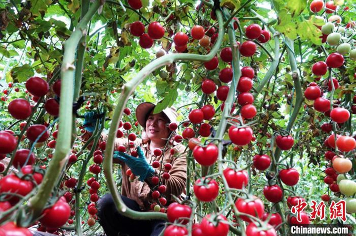 6月18日,夏至将至,山西省设施蔬菜大县运城市新绛县,西红柿、黄瓜等30多个品种10万亩设施蔬菜进入产销旺季。图为三泉镇席村菜农韩春燕冒着高温天气抢收圣女果。 高新生 摄