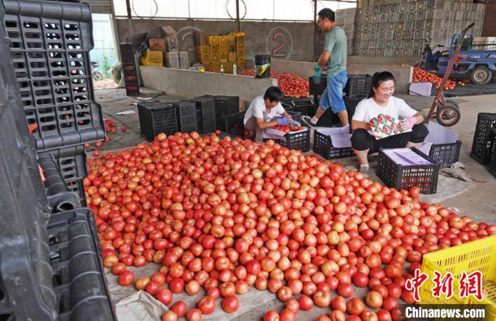 6月18日,山西省运城市新绛县泉掌镇王守庄村蔬菜批发市场,菜农冒着高温天气为客商装箱西红柿。 高新生 摄