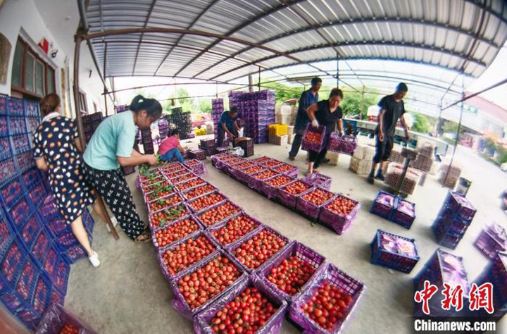6月18日,山西省运城市新绛县泉掌镇王守庄村蔬菜批发市场,菜农冒着高温天气为客商装箱圣女果。 高新生 摄