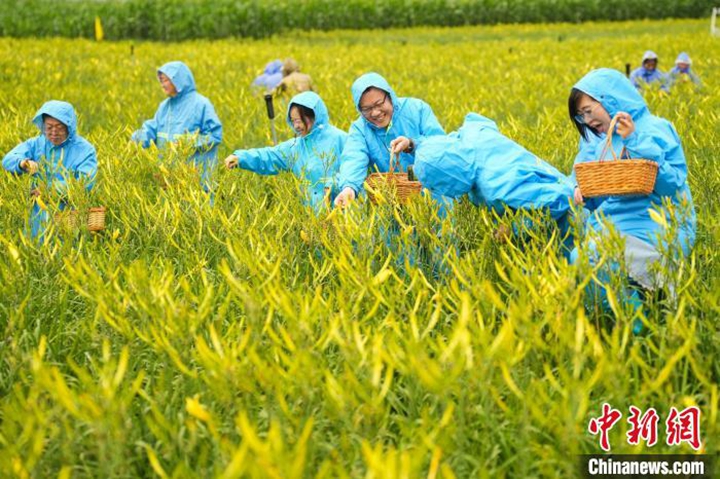 7月12日,山西大同云州区黄花进入丰收季,游客体验黄花采摘乐趣。大同是中国黄花主产地之一,有着约600年的黄花种植史。中新社记者 武俊杰 摄