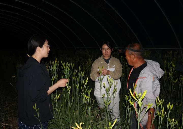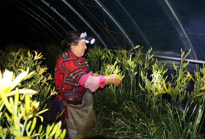 打开头灯,一只手扶住花葶,另一只手掐住花蕾的基部,从花蒂和苔梗连接处轻轻折断……鲜嫩的黄花一朵接一朵落入胸前的编织袋中。“选哪朵黄花摘是个眼力活。要选欲绽而未绽的黄花,采摘时要轻、巧、细、快,不能损伤花蕾。”吕踊红一边说一边为记者示范采摘方法。