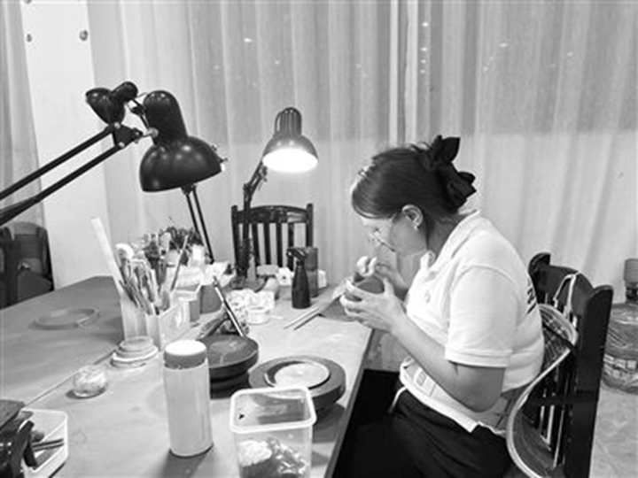 华廷陶瓷工艺师正精心制作紫砂壶。 记者 张磊 摄