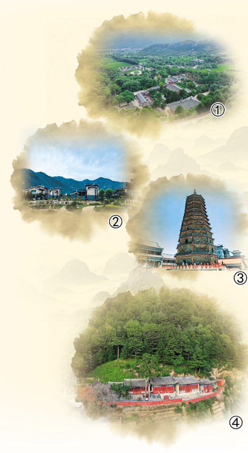 图①:群山环抱中的五台山佛光寺图②:五台山梵境里文旅小镇图③:五台山万佛塔图④:五台山黛螺顶