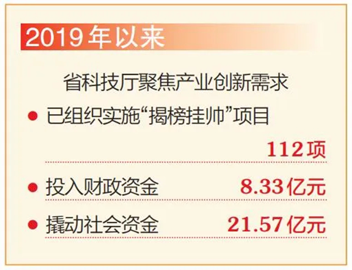 近年来,我省积极探索以“揭榜挂帅”方式组织实施科技重大专项项目,集中力量开展关键核心技术攻关。“揭榜挂帅”项目的实施,有效促进了产学研深入融合,取得了一批突破性科技创新成果,在解决技术与市场“两张皮”等方面发挥了重要作用。
