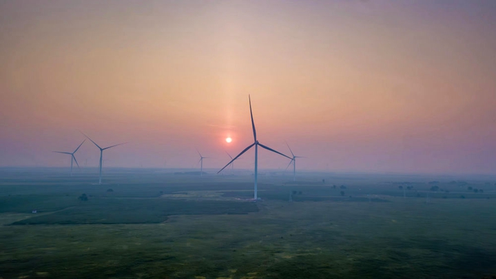 科尔沁大草原上,牛羊健硕。蓝天白云下,一排排巨型“风车”缓缓旋转,在古老草原上勾勒出现代的“天际线”。这里是内蒙古通辽市238万千瓦风电基地。