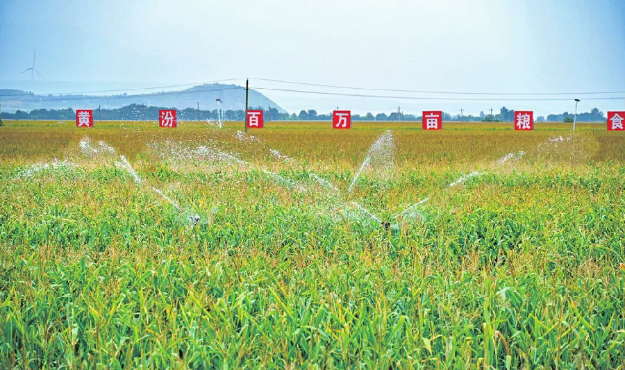 ▲9月10日,芮城县东垆乡一农田内,喷灌设施正对玉米进行浇水作业,为今年粮食丰产丰收打好基础。常奇摄