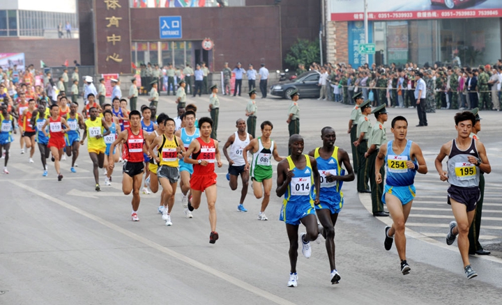 2010年9月5日,选手们在比赛中出发。当日,首届太原国际马拉松赛在山西省太原市举行。新华社记者 燕雁 摄