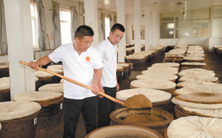 一旁,28岁的学徒李君正把缸里的醋醅翻到另一个醋缸之中。这是为了降温而进行的“打平翻缸”操作,要持续15天时间。“宋师傅说,发酵环节最难掌握的就是温度的控制和时机。”以前种地为生的李君,已经跟着宋俊鹏学了5年酿醋,一个月有将近4000元的收入,“学会独门技艺,咱也是手艺人了!”