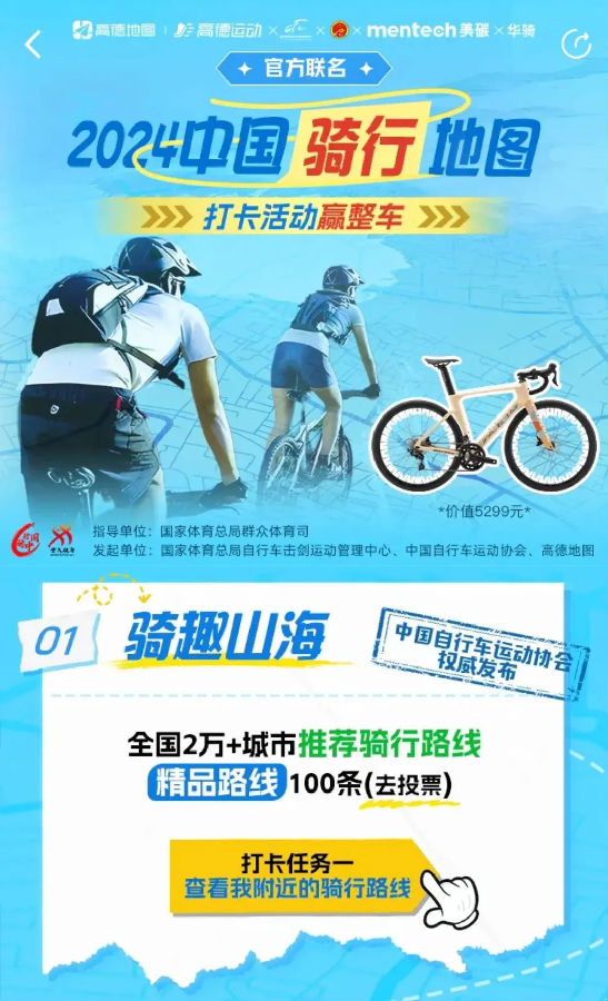 “中国骑行地图”涵盖110条精品骑行路线,依托中国骑行数字化平台,将整合全国的骑行路线信息,提供路线推荐、导航播报、社交互动及运动记录等功能,进一步促进智慧体育的发展,为骑行爱好者提供更便捷的服务。骑行爱好者在高德地图搜索“中国骑行地图”即可一键骑行精品路线。