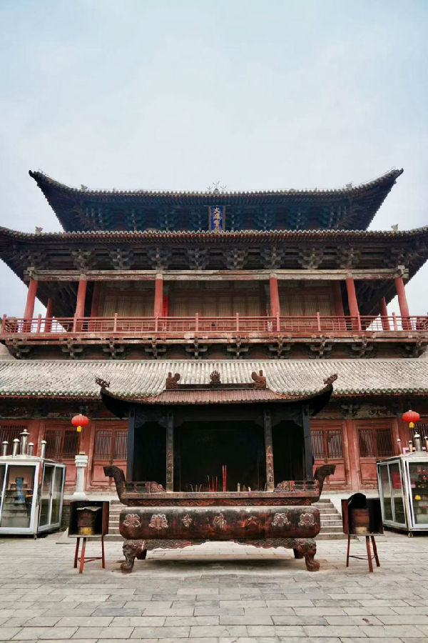 沿着台阶拾级而上,穿过天王殿便来到了大佛寺的核心——大雄宝殿。公开报道显示,这座大殿也是目前山西省面积最大的单体仿元建筑。