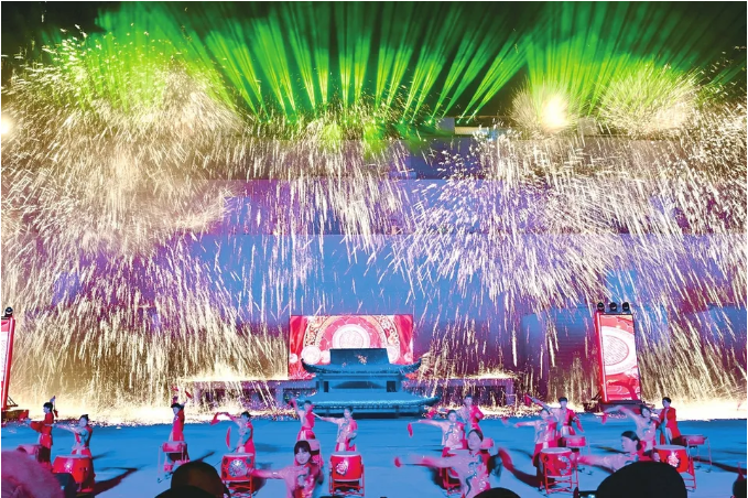 而不远处,无敌风火轮飞速旋转,炽热焰火映红了游人的笑脸;水上飞人结合火壶表演,舞出了“凤凰浴火涅槃”的视觉盛宴;烟花瀑布从高处奔涌而下,仿佛将整个银河都搬到了人间……