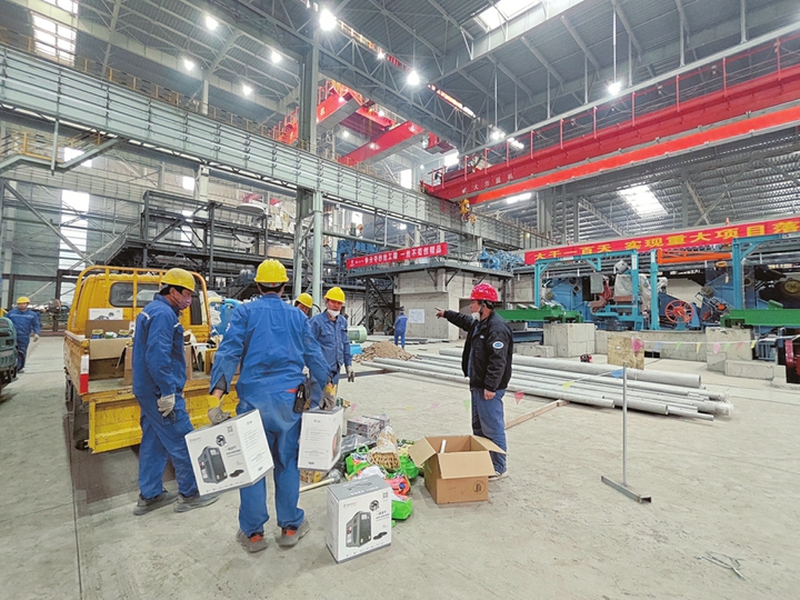一个个待组装的设备整齐排列,一辆辆工程车来回穿梭作业……走进宏达集团年产100万吨薄带铸轧项目工地,机器轰鸣,焊花飞溅,数百名工人分布在钢架“丛林”间进行铸机、轧机等设备的安装,不远处,“争分夺秒抢工期,一丝不苟创精品”的横幅格外醒目。