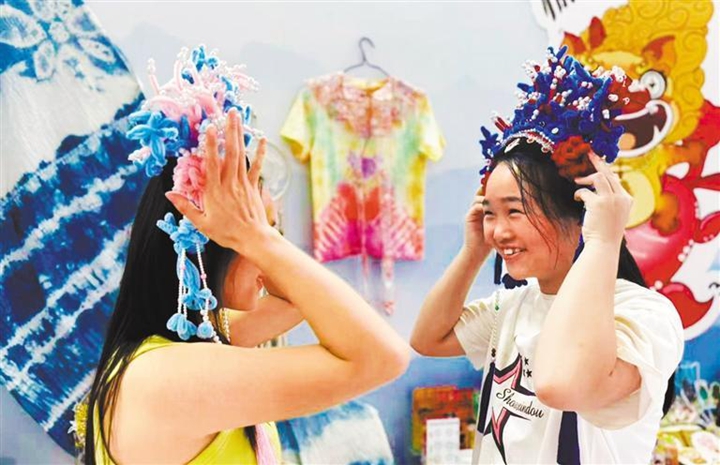 8月21日,在第七届山西文博会晋中市展区,精致秀美的头冠吸引游客穿戴体验。经济日报记者 梁 婧摄
