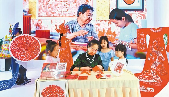 8月21日,国家级非遗代表性项目中阳剪纸市级代表性传承人武小汾在吕梁市展区和小朋友进行剪纸互动。赵夏雨摄(中经视觉)